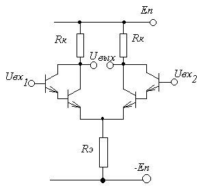 Обычно +/- Еп одинаковые. И если Uвх близки к нулю, то на эмиттерном сопротивлении падает большое и почти постоянное напряжение, поэтому ток, протекающий через это сопротивление, тоже почти постоянный. Это значит, что мы задали ток эмиттеров. Далее этот ток разделяется на две части, и протекает через два транзистора. А теперь давайте рассмотрим случай одинаковых входных напряжений – синфазный входной сигнал. Теоретически если на входах синфазный сигнал, то ток, протекающий через транзисторы, будет одинаковый, то-есть разделится пополам. Но этот ток задан резистором и почти не зависит от входного сигнала. Поэтому отклик на синфазный сигнал очень мал, а так как мы на выходе берём разностный сигнал, то он вообще близок к нулю. Это обусловлено тем, что в эмиттере напряжение будет меняться почти также, как и в базах: разность потенциалов между базой и эмиттером меняется гораздо меньше, чем на входах. Дифференциальный сигнал также одинаков на обоих входах, но противоположен по фазе. Поэтому на эмиттерах напряжение почти не меняется, полный эмиттерный ток тоже, а на базах транзисторов напряжение меняется гораздо сильнее, и это приводит к тому, что токи через транзисторы меняются в разные стороны: на одном транзисторе увеличивается, а на другом – уменьшается, хотя в сумме он остался неизменным. Поэтому сигнал на выходе (на коллекторах) будет сильным, да ещё в два раза больше, так как он получается как разность между двумя коллекторами. Дело заключается в том, что для синфазного сигнала схема аналогична схеме с ОК: есть сильная ООС благодаря наличию эмиттерного сопротивления; а для дифференциального сигнала – аналогична схеме с ОЭ: напряжение на эмиттерах практически не меняется, поэтому можно считать, что эмиттеры как бы заземлены. Итак, дифференциальный сигнал хорошо усиливается, как в схеме с ОЭ, а синфазный сигнал сильно ослабляется, как в схеме с ОК во-первых, и за счёт вычитания коллекторных сигналов во-вторых. Если сигналы Uвх1 и Uвх2 произвольные, то можно вычислить синфазную и дифференциальную составляющие по формулам: