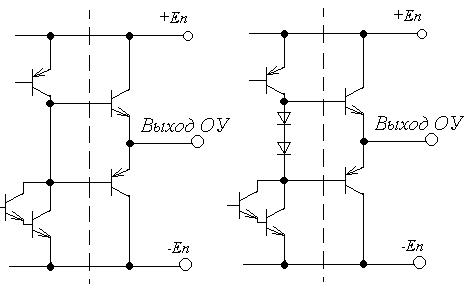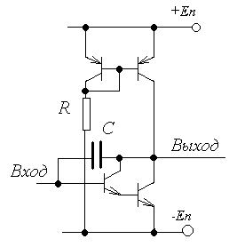 Мы представили здесь полную схему. Основные транзисторы – это сдвоенный транзистор внизу, включённый по схеме ОЭ. На базу этого транзистора подаётся входной сигнал. В коллекторе транзистора стоит активная нагрузка – второй транзистор токового зеркала. Кроме того, здесь изображён конденсатор С, который выполняет коррекцию частотной характеристики; она необходима для предотвращения нестабильности ОУ. Следует отметить, что он не всегда включается в схему, есть ОУ без коррекции. Тогда, в случае возникновения нестабильности надо ставить конденсатор в обратную связь всего ОУ. Дальнейшее усиление в ОУ невозможно, так как ОУ с тремя каскадами усиления становится слишком неустойчивым. Однако можно сделать усиление мощности за счёт каскада с ОК. Обычно частотная характеристика таких каскадов очень хорошая, поэтому для ОУ она не вносит ничего отрицательного. Схема этого каскада изображена на рис.: