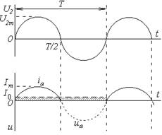 Напряжение на нагрузке состоит из полусинусоид вторичного напряжения трансформатора, следующих одна за другой. После разложения в ряд Фурье напряжение такой формы можно представить в виде