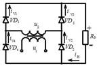 Рис.1. Однофазная мостовая схема выпрямления Временные диаграммы для мостовой схемы, изображённы на рисунке 2. У мостовой схемы в каждом полупериоде ток проходит одновременно через два диода (например, VD1, VD2), потому временные зависимости токов и напряжений будут принадлежать парам вентилей. Среднее значение напряжения на выходе выпрямителя