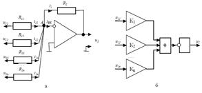 Таким образом, суммирующий усилитель выполняет математические операции усиления каждого из входных напряжений, их суммирования и ин- вертирования, что показано на рис. 1.8, б. Если выбрать сопротивления резисторов одинаковыми, то все коэффици- енты передачи (1.12) будут равны, и мы получим сумматор напряжений. Отметим особенности этой схемы: - возможность обработки сразу нескольких напряжений, причем на раз- ные входы могут подаваться напряжения различного характера (например, постоянные и переменные); - имеется возможность независимого изменения коэффициента передачи для каждого из входных напряжений; - поскольку суммирующий усилитель является разновидностью инверти- рующего усилителя, то входное сопротивление для каждого напряжения ZiВХ = R1i, поэтому при большом выходном сопротивлении источника сигнала необходимо использовать повторители напряжения, включаемые между ис- точником сигнала и соответствующим входом.