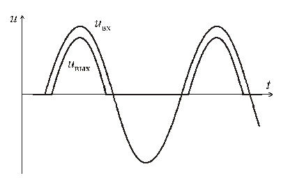 Сопротивление резистора RФ обычно задаются в пределах RФ = (0,15…0,5)RH; КПД резистивно-емкостного фильтра сравнительно мал и обычно составляет 0,6…0,8, причем при ηф = 0,8 RФ = 0,25RH. Преимущества резистивно-емкостных фильтров: малые габариты, масса и стоимость; недостаток – низкий КПД. Выпрямители служат для преобразования переменного напряжения питающей сети в постоянное. Основными компонентами выпрямителей служат вентили – элементы с явно выраженной нелинейной вольт-амперной характеристикой. В качестве таких элементов используют кремниевые диоды. Однополупериодный выпрямитель. Простейшим является однополупериодный выпрямитель (рис. 1.1.2). Напряжение и ток нагрузки имеют форму, показанную на рис. 1.1.3. Выходное напряжение меньше входного на величину падения напряжения на открытом диоде.