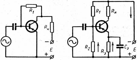 Коллекторная схема стабилизации исходного режима имеет тот недостаток, что через сопротивление R1 устанавливается обратная связь между выходом и входом; усиленный сигнал, попадая обратно на вход, снижает коэффициент усиления и входное сопротивление каскада.