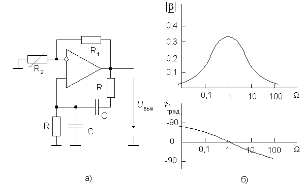 Сопротивление резистора RФ обычно задаются в пределах RФ = (0,15…0,5)RH; КПД резистивно-емкостного фильтра сравнительно мал и обычно составляет 0,6…0,8, причем при ηф = 0,8 RФ = 0,25RH. Преимущества резистивно-емкостных фильтров: малые габариты, масса и стоимость; недостаток – низкий КПД. Простейшая схема RC -генератора синусоидальных колебаний на операционном усилителе приведена на рис. 37а.