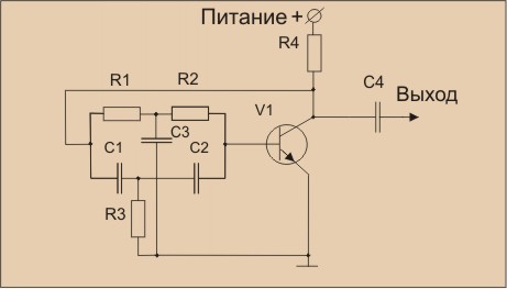R в этой формуле - значения сопротивлений R1,R2, (они одинаковые). C - это соответственно, любое из значений емкости С1 или С2 (также одинаковые) Генератор на основе моста Вина – двухкаскадный усилитель с цепью опережения-запаздывания и делителем напряжения.