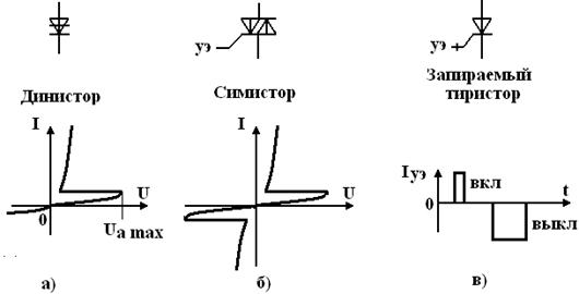 В обычном состоянии тиристор заперт. В схеме существует два устойчивых состояния: открытое (точка А) и закрытое (точка В). Повышение напряжения источника от 0 до Е при Iуэ = 0 приводит к перемещению рабочей точки по нижнему участку характеристики. Если подать импульс тока управления Iуэ достаточный для включения, то р.т. перейдет в точку А и цепь управления перестанет влиять на процессы в анодной цепи тиристора – цепь управления не нужна. Это система с внутренней положительной обратной связью, поэтому тиристоры имеют большой коэффициент усиления по мощности. Обычно Е всегда меньше напряжения включения «по аноду» (Uamax) на 20…30%. Выключить тиристор можно только путём уменьшения Iа до уровня меньше тока удержания (Iуд), за счёт увеличения Rн или уменьшения Е. В открытом состоянии тиристоры пропускают большие токи (сотни ампер), но они инерционны, время включения составляет 0,1…10 мкс, а время выключения 1…100 мкс. Для надёжной работы тиристора нельзя превышать некоторую критичную скорость нарастания анодного напряжения. В противном случае существует опасность ложного включения через паразитные ёмкости p-n переходов. Обычно скорость нарастания анодного напряжения лежит в пределах dUа/dt =10...500 В/мкс и УЭ тиристора шунтируют резистором величиной от 51Ом до 1.5кОм. Наряду с рассмотренным тиристором имеется группа четырёхслойных приборов с разнообразными свойствами это динисторы, симисторы и запираемые тиристоры. Они приведены на рис. 3.44.