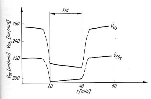 Рис. 27. Падение потребления кислорода (VО2) и выделения углекислого газа (VCO2) при ТМ (Wallage, Benson 1972). Brebbia и Altschuber (1965) описывают падение потребления кислорода (VO2) в 3-й и 4-й фазах глубокого сна по сравнению с БДГ-фазой примерно на 20 мл O2/мин, причем в БДГ-сне потребление кислорода возрастает, возможно, вследствие моторной активности, которая обусловлена данной фазой сна. В исследованиях Jana (1965) основной обмен понижался во сне на 8,73% по отношению к бодрствованию (измерялось потребление кислорода за 1 час, т.е. сон не делили по фазам, так как они короче, чем 1 час). Напротив, в состоянии гипноза Jana не обнаружил изменений потребления кислорода по сравнению с состоянием бодрствования. Все исследователи описывают резкое падение энергообмена при медитативных практиках. Уменьшение потребления кислорода при ТМ примерно на 40 мл O2/мин ниже фактического уровня обмена покоя (соответствует приблизительно 20% основного обмена) побудило Wallace, Benson и Wilson (1971) назвать вегетативное состояние, вызванное ТМ, «гипометаболическим состоянием бодрствования» (рис. 28).