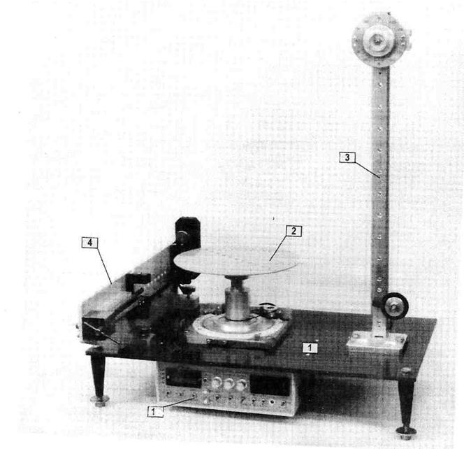 Стол поворотный состоит из платформы 2 с отверстиями для фиксации изучаемых объектов, закрепленной на стойке 3. На трехступенчатом шкиве стойки (диаметром 24, 48 и 96 мм) установлены штифты для закрепления нитей. Стойка вращается на подшипниках на вертикальной оси, закрепленной в основании со шкалой 1. Снизу к стойке прикреплен диск 3.1 с диаметрально противоположными радиальной прорезью и риской указателем. Риска перемещается вдоль, шкалы по которой отсчитывается угловая координата стола с разрешением 1 градус, при прохождении прорези через зазор фотодатчика 6. Это соответствует положению риски на нулевом делении шкалы – срабатывает таймер измерительной системы ИСМ – 1К. Это позволяет фиксировать время поворота стола на 360° или 720°. Внутри стойки под центральным отверстием платформы размещен упругий контакт 4, через который подается питание к устройствам, расположенными на платформе. Рядом со столом установлен механический тормоз с кнопкой 5.1 и защелкой 5.2. При нажатии на кнопку вниз стол затормаживается, а защелка фиксирует кнопку в нижнем положении. Для отпускания тормоза нужно сдвинуть защелку на себя.