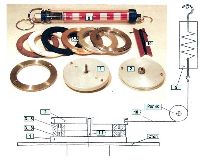 Трибометр (рис.6) предназначен для измерения сил трения, возникающих между различными фрикционными парами. Он состоит из диска 1 и диска–шкива 2, на которые надеваются кольца из набора 3–8 из исследуемого и контактирующего материала, динамометра 9, который подвешивается к стойке и соединяется с диском–шкивом 2 через ролик нитью 10.