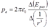 c) Рассчитайте значения напряженности электрического поля E1 и потенциала по формулам: d) Рассчитайте значение Eрез: Eрез= E1 + E2. e) Постройте на одном листе графики зависимости напряженности электрического поля Ерез точечного заряда от 1/r3 (где r -расстояние от середины диполя до рассматриваемой точки f) По тангенсу угла наклона графика определите электрический дипольный момент pe, используя формулу: