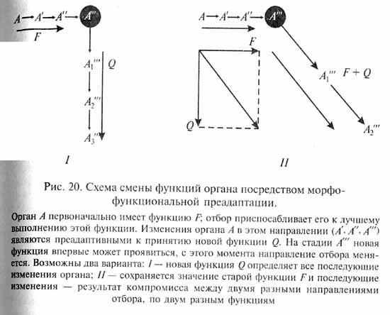 Однако в этой проблеме имеется ряд сложных вопросов, и некоторые из них отчетливо представлял уже Ч.Дарвин. Первая трудность связана с тем, как отбор может контролировать начальные этапы развития нового приспособления, когда новая структура (или функция) еще столь слабо выражена, что ее небольшие изменения не могут принести организму каких-либо заметных выгод. Пытаясь разрешить эту проблему, Ч.Дарвин в некоторых случаях даже пытался привлечь "унаследование последствий употребления и неупотребления органов" (например, для объяснения развития асимметричного расположения глаз у камбал или развития цепкого хвоста у южноамериканских обезьян). Очевидно, такое объяснение было шагом назад по отношению к теории естественного отбора и не может быть признано удовлетворительным. Особенно трудно объяснить действие отбора на первых этапах развития таких сложных органов, которые вообще могут эффективно функционировать только при достаточно высокой степени своего развития. Таковы, например, уже упоминавшиеся нами сложные адаптации - летательный аппарат птиц, звукопроводящая система среднего уха наземных позвоночных, плавательный пузырь костистых рыб, грудная клетка амниот в роли легочного воздушного насоса и т.п. Трудно понять, какую приспособительную ценность для организма могут иметь первые зачатки подобных сложных органов и как на них будет действовать отбор, поскольку естественный отбор не может "предвидеть" будущего развития данного признака и его будущего значения для организма. Развитие приспособлений на основе преадаптаций Путь к решению этой проблемы помогает найти концепция морфофункциональных преадаптаций. Сам термин "преадаптация" принадлежит французскому ученому Л. Кено. Кено понимал под преадаптациями такие особенности организмов, которые возникают как случайные вариации, первоначально безразличные для организма (т.е. не приносящие ему ни вреда, ни заметной пользы), нo после изменения условий существования или образа жизни Данного вида оказываются готовыми приспособлениями, полезными в новых условиях. Очевидно, эти представления Кено о развитии приспособлений из случайных преадаптаций без участия естественного отбора примыкают к воззрениям ранних генетиков-мутационистов (см. с. 44). Однако в концепции Кено было все же рациональное зерно, заключавшееся в предположении, что Сложные приспособления к каким-либо конкретным условиям Могут первоначально развиваться в совершенно иной среде обитания и выполнять другую роль, и лишь позднее - в новых условиях - принять на себя новые, прежде им не свойственные функции. Кено справедливо указывал, что освоение новой среды обитания любым видом организмов возможно только при наличии у него таких особенностей строения, физиологии и поведения, которые дают возможность выжить в новых условиях, но возникнуть эти особенности могли только до начала освоения нового образа жизни, т. е. в прежней среде обитания. Такие особенности и являются преадаптивными. Кено обратил внимание на то, что, в сущности, уже Дарвин подошел к идее преадаптации, анализируя в "Происхождении видов" развитие некоторых приспособлений. Так, швы между костями черепа млекопитающих облегчают прохождение головы детеныша при родах, однако наличие таких сочленений между костями черепа связано совсем не с 