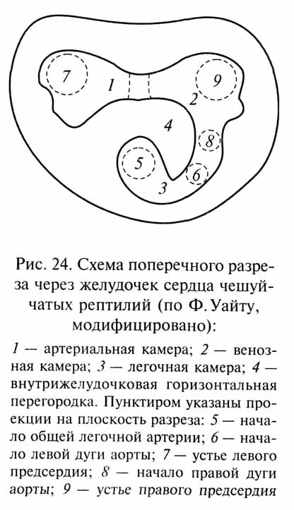 При анализе подобных ситуаций неизбежно возникает вопрос: как объяснить развитие инадаптивных изменений? Не противоречит ли "инадаптивная эволюция" представлениям о развитии приспособлений под контролем естественного отбора? Однако противоречия здесь нет. Дело в том, что на первых этапах эволюционных преобразований многих органов (в данном случае - в процессе редукции боковых лучей конечностей у парнокопытных) и адаптивные, и инадаптивные варианты изменений могут быть примерно в равной степени полезны для вида. Естественный отбор благоприятствует любому изменению, повышающему приспособленность организмов, вне зависимости от того, как пойдет развитие этого признака в дальнейшем. Строго говоря, термин В.О.Ковалевского "инадаптивная", т.е. неприспособительная, эволюция неудачен, так как отбираются только приспособительные (адаптивные) изменения организмов. Однако в ходе дальнейшей эволюции обнаруживается преимущество одного пути эволюционных преобразований перед другими. Механическое несовершенство конечностей "инадаптивных" форм копытных выявилось лишь при достаточно далеко зашедшей редукции боковых пальцев, а в начале этого процесса указанные формы, вероятно, ничем не уступали представителям "адаптивных линий". Таким образом, можно назвать инадаптивным такой путь филогенетических изменений, при котором формирующееся приспособление заключает в себе предпосылки для возникновения тех или иных внутренних противоречий, которые нарастают мере развития приспособления, приводя в конечном итоге к эволюционному тупику. Как показал В.О.Ковалевский, на начальных стадиях развития инадаптивные изменения могут даже и определенные преимущества перед более медленно протекающими гармоническими преобразованиями - именно благодаря быстроте развития инадаптивных вариантов. Гармонические преобразования требуют большего числа эволюционных "проб и ошибок" и соответственно большего времени для своего осуществления. Вероятно, можно сказать, что быстрота эволюционных преобразований нередко оказывается обратно пропорциональной степени их совершенства. Инадаптивный путь эволюции не обязательно ведет к вымиранию - возникшие противоречия могут быть различными способами компенсированы. Рассмотрим, например, эволюционные преобразования сердца у рептилий завропсидного ствола (черепахи, клювоголовые, ящерицы, змеи, крокодилы). У предков завропсидных пресмыкающихся в желудочке сердца возникла горизонтальная перегородка, разделившая его на спинную и брюшную камеры и способствовавшая распределению артериальной крови в дуги аорты, а венозной - в легочную артерию (рис. 24). Однако полное разделение желудочка этой перегородкой, которое совершенно прекратило бы смешивание артериальной и венозной крови, невозможно - при этом легочная артерия, начинающаяся от брюшной камеры желудочка, оказалась бы отрезанной от обоих предсердий, открывающихся в спинную камеру. В результате у большинства пресмыкающихся перегородка в желудочке сердца остается неполной и сохраняется смешивание артериальной и венозной крови в сердце, что препятствует интенсификации метаболизма до уровня, необходимого для достижения гомойотермии (независимости температуры тела от температуры внешней среды). У предков крокодилов и птиц первичная горизонтальн