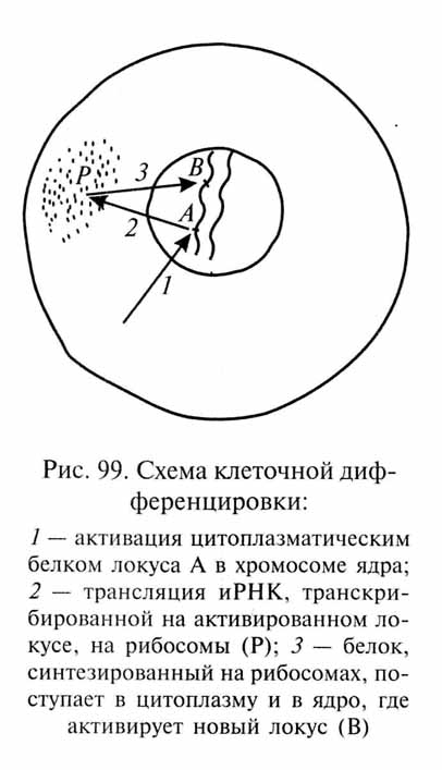 Между мутациями и их проявлением в фенотипе лежат сложные процессы морфогенеза, в ходе которых наследственная информация, преобразуясь, переходит на все более высокие уровни (молекулы - клетки - ткани - органы). В то же время развивающийся организм подвергается воздействию различных внешних Факторов, направляющих процессы морфогенеза в те или другие русла, приводя к формированию конкретных фенотипических особенностей. Сущность этих процессов и механизмы преобразования информации известны еще сравнительно слабо; обобщающая теория индивидуального развития еще не создана. Это очень затрудняет использование эмбриологических концепций в эволюционистике. Данные и обобщения онтогенетики еще не заняли подобающего места в синтетической теории эволюции. Дифференцировка организма в онтогенезе Одной из основных проблем онтогенетики, решение которой должно сыграть важную роль и для эволюционной теории, остается сущность явлений онтогенетической дифференцировки, т. е. тех процессов, которые ведут к развитию разнокачественности различных фенотипических структур, возникающих в онтогенезе, в конечном итоге, из единственной клетки - зиготы. Даже в организации столь просто устроенных животных, как кишечнополостные, насчитывается около 10 разных типов клеток, а в организме млекопитающих - порядка 1000 типов клеток. Клетки разных типов группируются в ткани и формируют многотканевые комплексы со сложной пространственной структурой - органы. По современным представлениям, в процессе дробления зиготы на бластомеры и при последующих делениях соматических клеток каждая дочерняя клетка в норме получает 100 % наследственной информации, т.е. полный набор генов, точно соответствующий исходному генотипу зиготы. Однако соматические клетки резко различаются по строению и функциям (достаточно сравнить, например, нейрон, мышечную клетку и эритроцит в одном организме). Можно считать установленным, что различия соматических клеток определяются дифференциальной активностью генов (другими словами, в одних типах клеток активны одни, а в других - другие участки хромосом). Неактивные в данной клетке гены блокируются какими-то входящими в состав хромосом веществами, какими именно - еще точно не выяснено. Предполагают, что этими веществами (репрессорами) являются те или иные хромосомные белки (многие ученые считают репрессорами белки-гистоны). Очевидно, при эквивалентности генома всех зародышевых клеток их первоначальная дифференцировка должна определяться разнокачественностью их цитоплазмы. В период дробления практически не происходит роста клеток между их последовательными делениями. Поэтому в разные бластомеры попадают различные и, вероятно, разнокачественные участки цитоплазмы зиготы-Возможно, разнокачественность цитоплазмы и определяет активацию различных генов в разных бластомерах. Деятельность активированных генов приводит к изменениям цитоплазмы бластоме-ров - специфическим в разных клетках. Измененное цитоплазма-тическое окружение взаимодействует с геномом клетки, вызывая избирательную активацию новых групп генов и репрессируя другие группы. Так запускается цепь последовательных взаимодействий между геномом и цитоплазмой, протекающая по принципу обратной связи (положительной для одних и отрицательной для других генных 