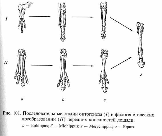Взаимоотношения онтогенеза и филогенеза Проблему взаимоотношений индивидуального развития организмов и их эволюции затрагивал уже Ч.Дарвин, подчеркивавший влияние естественного отбора на все стадии индивидуального развития и формирование под контролем отбора специфических личиночных приспособлений. Позднее эту проблему разрабатывали Ф. Мюллер, Э. Геккель, В.Гарстанг, Г. де Вир и другие ученые. В эволюционно-морфологическом плане соотношение онтогенеза и филогенеза наиболее полно было рассмотрено А.Н.Северцовым в его теории филэмбриогенезов (1912-1939). Согласно этой концепции филогенез не следует рассматривать как ряд сменянющих друг друга статических взрослых состояний организмов последовательных поколений (понимание филогенеза как эволюции взрослого состояния до сих пор очень распространено благодаря концентрации внимания ученых-неэмбриологов на взрослых организмах). По А.Н.Северцову, филогенез представляет собой генетический ряд онтогенезов: эволюционируют не только фенотипы взрослых организмов, но и их онтогенезы, или кратко - филогенез есть эволюция онтогенеза. Изменчивость организмов проявляется на всех стадиях индивидуального развития и служит материалом для действия естественного отбора. А.Н.Северцов разработал классификацию разных типов филогенетических изменений онтогенеза, которые он прежде всего разделил на ценогенезы и филэмбриогенезы. Ценогенезы представляют собой приспособления развивающегося организма к специфическим условиям эмбрионального или личиночного развития, которые не сохраняются во взрослом состоянии и не сказываются на особенностях последнего. Таковы, например, роговые зубы и жаберный фильтрационный аппарат личинок бесхвостых амфибий, плацента и зародышевые оболочки у эмбрионов млекопитающих и т.п. С другой стороны, филэмбриогенезы - это изменения онтогенеза, связанные с эволюционными преобразованиями каких-либо признаков взрослого организма. Филэмбриогенезы могут происходить как на самых поздних стадиях индивидуального развития (надставка, или анаболия), так и на средних (уклонение, или девиация) или на ранних (архаллаксис) стадиях. Из сказанного выше следует, что эволюция посредством анаболии в целом более обычна, чем посредством девиации и тем более архаллаксиса. При этом следует иметь в виду, что между разными формами филэмбриогенезов нет отчетливых границ. Более того, некоторые эволюционные изменения, первоначально возникшие как изменения поздних стадий онтогенеза (анаболии), могут в ходе дальнейшей эволюции сместиться на более ранние стадии, т. е. вторично преобразоваться в девиации и архаллаксисы. Это может быть связано с необходимостью более раннего выявления в онтогенезе нового адаптивного признака. Такой эффект достигается посредством более ранней онтогенетической активации соответствующих генов. Только на тех стадиях онтогенеза, которые не подверглись ценогенезам или филэмбриогенезам, сохраняется сходство с состоянием соответствующих стадий онтогенеза предков. Такое повторение предкового состояния - рекапитуляция - может сохраняться только для отдельных эмбриональных структур или процессов, но не для всего организма в целом, как полагал Э. Геккель. Обобщение Геккеля, известное как "основной биогенетический закон" (онтогенез есть сжатое и сокраще
