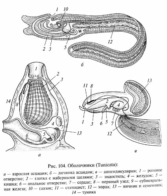 При педоморфозе происходит наследственное изменение (уменьшение чувствительности соматических тканей личинки к гормонам, стимулирующим метаморфоз), что приводит к полной утрате взрослой стадии онтогенеза: жизненный цикл укорачивается, последней в нем становится стадия, которая была прежде личиночной. Такой педоморфоз произошел, например, в эволюции некоторых групп хвостатых земноводных (протеи, сирены, рис. 103). На основе педоморфоза сформировалась организация аппендикулярий (Appendiculariae) - одного из классов подтипа низших хордовых - оболочников (Tunicata). Вероятно, предки аппендикулярий имели жизненный цикл со свободноплавающей личинкой и прикрепленной неподвижной взрослой стадией, подобно современным асцидиям (Ascidiae). В результате педоморфоза у предков аппендикулярий прикрепленная взрослая стадия онтогенеза была утрачена, и строение современных представителей этой группы во многом остается близким к строению личинок асцидий (имеются хорда, сегментированные мышцы, спинной нервный ствол и др., рис. 104).