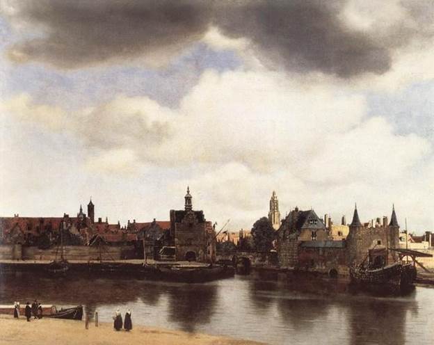 фаянсе. У Вермера голубой цвет кажется не холодным, а теплым и, обладая несравненной воздушностью, остается вполне материальным. Замечательно одухотворенной кажется легкая, написанная как бы на одном дыхании «Головка девочки» в Гаагском музее, хотя и она не заключает в себе никаких психологических глубин. Чтобы почувствовать, что такое настоящая живопись, может быть, и не обязательно пересмотреть сотни и тысячи картин, наполняющих залы музеев. Важнее выбрать из множества всего несколько десятков и смотреть их со всем вниманием. Скромная «Головка» Вермера будет в числе таких «ключевых» произведений живописи, как бы тщательно и вызывательно их ни отбирать. В их числе будет и «Вид Делфта» Вермера. Панорама Делфта с ее живописным силуэтом, отраженным в реке, написана вопреки условным приемам пейзажной живописи, существовавшим тогда, прямо с натуры и без всяких «кулис» на первом плане. Это самый настоящий пленэрный, то есть напоенный светом и воздухом, пейзаж, написанный за два столетия до того, как живопись на пленэре (на открытом воздухе стала явлением распространенным. Только что прошел дождь, завеса облаков редеет и тает, через них начинает сквозить солнечный рассеянный свет, вызывая мерцающую игру непросохших дождевых капель. Тончайшее атмосферное состояние – между отшумевшим дождем и еще не совсем пробившимся солнцем – Вермер передает, сохраняя всю свойственную ему материальность и густоту цвета, но усиливая зернистую фактуру живописной кладки. Он пишет мелкими мазками-точками (но не раздельными, как впоследствии у пуантилистов, а плотно друг к другу прилегающими), отчего усиливается впечатление вот-вот засверкать тысячами искр.