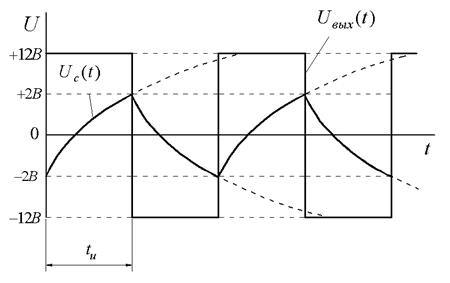 Мультивибратором называется генератор периодически повторяющихся импульсов прямоугольной формы (выполняются на основе триггера Шмита). Мультивибратор является автогенератором и работает без подачи входного сигнала. Рассматриваемый генератор является симметричным и для него длительность импульса и паузы равны tи=tn=R2C×ln(1+ Предположим, что на выходе напряжение +12В, а на неинвертирующем входе +2В. Конденсатор заряжается через