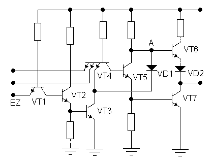 Сравнительные характеристики серии логических микросхем. Логические элементы с тремя выходными состояниями (Z-состояние). Когда VT3 заперт, схема действует подобно обычному логическому элементу 2И-НЕ, т.к. VD1 смещен в обратном направлении. Если VT3 открыт, VD1 также открыт. U в точке А близко к нулю и VT6 заперт. VT5 также заперт, т.к. на эмиттере VT4, который связан с коллектором VT3, логический ноль. Следовательно, VT7 также заперт, и выходной вывод окажется отсоединенным от входных цепей и обеих шин питания. При этом уменьшается также потребляемая микросхемой мощность.