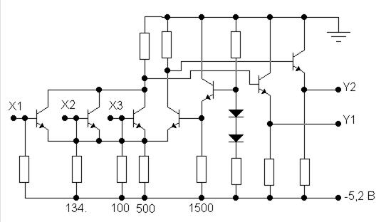 U0 = -0,7 ÷ -0,95 ≈ -0,8 U1 = -1,45 ÷ -1,95 ≈ -1,6 Высокое быстродействие достигается тем, что транзисторы дифференциального каскада и другие не входят в режим насыщения, а также малой разницей между уровнем логического «0» и логической «1» (0,8В). Последнее, в свою очередь, ухудшает помехоустойчивость. Для согласования микросхем различных видов логики используются микросхемы преобразования уровня.