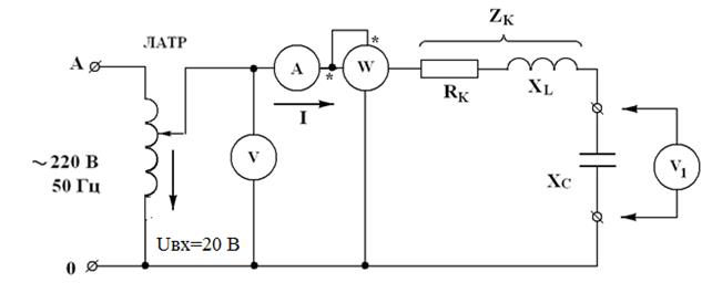 Рис.14. Схема исследования цепи переменного тока с последовательным соединением катушки и конденсатора.