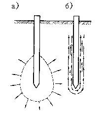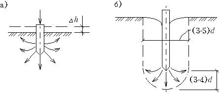 В маловлажных песчаных грунтах несущая способность свай во времени снижается. Это объясняется тем, что под концом сваи при забивке образуется зона уплотнения (рис.Ф.14.33,а), которая после прекращения процесса забивки сваи уменьшается за счет релаксации напряжений, что и приводит к уменьшению первоначальной несущей способности сваи. Это явление подтверждается контрольной добивкой сваи после отдыха - интервала времени. Отказ до отдыха называется ложным, а отказ после отдыха - истинным. Поэтому в песчаных грунтах величина отказа после отдыха будет больше, чем без отдыха. В глинистых грунтах отказ после отдыха будет меньше, чем до отдыха, так как при забивке сваи происходит разрушение структурных связей, рост гидродинамического давления воды и ее движение по стволу сваи вверх, что играет роль смазки, уменьшая в совокупности несущую способность сваи. После отдыха сваи происходит засасывание сваи в грунт за счет частичного восстановления структурных связей.
