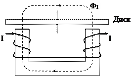 Счётчик электрической энергии представляет собой прибор для учёта электрической энергии, потребляемой потребителем за некоторый промежуток времени и относится к интегрирующим измерительным приборам. В цепях переменного тока используются счётчики индукционной системы. Измерительный механизм однофазного индукционного счётчика состоит из двух электромагнитов, расположенных у края лёгкого вращающегося алюминиевого диска, который является подвижной частью прибора с неограниченным углом поворота. Один из электромагнитов, расположенный ниже диска, имеет U-образный сердечник. Его обмотка расположена но обеих стержнях и содержит сравнительно небольшое количество витков толстой медной проволоки (рис 7.1а). Эта обмотка является токовой обмоткой и включается последовательно с нагрузкой. При протекании по ней тока нагрузки магнитный поток Фi, создаваемый этим электромагнитом, дважды пронизывает диск (+ Фi, - Фi). Фаза потока Фi почти полностью совпадает с фазой тока протекающего через токовую обмотку и нагрузку, а его величина пропорциональна току нагрузки.