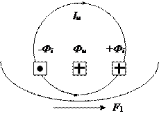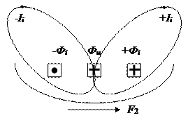 Второй электромагнит, установленный над диском, имеет обмотку содержащую несколько тысяч витков (18-20 тысяч) тонкого медного провода и рассчитана на напряжение питающей сети 220 В (рис. 7.1б). Эта обмотка включается параллельно нагрузке и является обмоткой напряжения. Магнитный поток этого электромагнита Фu пронизывает диск счётчика один раз. Поскольку индуктивное сопротивление XL этого электромагнита много больше его активного сопротивления R ( Таким образом, алюминиевый диск принизывают три переменных магнитных потока: + Фi, - Фi, сдвинутые на 180о, и Фu сдвинутый относительно Фi на 90о. Эти потоки индуцируют в диске вихревые токи Ii и Iu, соответственно (рис. 2). Вихревые токи взаимодействуют с магнитными потоками, их порождающими: ток Ii взаимодействует с магнитным потоком Фu, а ток Iu взаимодействует с магнитным потоком Фi. В результате на диск действует пара сил F 1 и F 2. Учитывая изменение токов Ii и Iu (направление токов зависит от того, возрастает или убывает создающий их в данный момент поток), используя правило Ленца и правило левой руки, находим, что силы F 1 и F 2, создающие вращающий момент, имеют одинаковое направление (рис. 7.2). Величина действующего на диск вращающего момента пропорциональна активной мощности нагрузки Р: