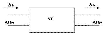 Входными характеристиками транзистора при включении с ОЭ являются зависимости тока базы от напряжения между ней и эмиттером при постоянных напряжениях на коллекторе (рис. 33, а): IБ = f(UБЭ) при UКЭ = const. Выходные характеристики (рис. 34, б) представляют собой зависимости тока коллектора от напряжения между ним и эмиттером при постоянных токах базы: IК = f(UКЭ) при IБ = const. В режиме усиления малых сигналов транзистора включённый с ОЭ, эквивалентно представляют в виде линейного четырёхполюсника (рис. 34), входные и выходные параметры которого связаны следующими уравнениями:
