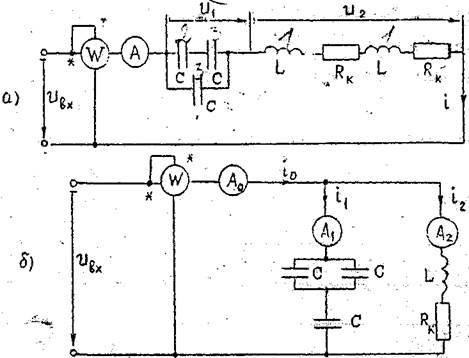 На рис.5.2 даны примеры (отличные от реально получающихся в данной лабораторной работе) электрических цепей, в которых за счет подбора, групп конденсаторов и катушек индуктивности реализованы условия резонансов (5.1) и (5.2). Здесь же показано включение измерительных приборов, с помощью которых контролируется достижение резонансов в рассматриваемых цепях.