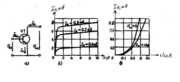 Коэффициент передачи тока базы схемы ОЭ β= ΔIк/ΔIб при Uкб=const; β= а /(1-а)>>1. Эта схема обеспечивает усиление тока и напряжения сигнала и максимальное усиление мощности. Основными характеристиками транзисторов ОЭ являются 1) выходные - Iк,(Uкэ) при Iб=const (рис.2,б), 2) входные - Iб(Uбэ) при Uкэ =const (рис.2,в). Они определяют связь между постоянными составляющими токов и напряжений, дают возможность выбрать наилучший режим работы, оценить нелинейные искажения усиливаемого сигнала. Для расчета цепей с биполярными транзисторами в настоящее время используются h- параметры: транзистор представляют четырехполюсником и записывают уравнения четырехполюсника в h -параметрах (рис. 3).