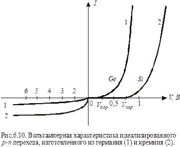 называют током насыщения р-п перехода или обратным тепловым током. Как вытекает из (2), ток насыщения определяется концентрацией неосновных носителей тока, что обуславливает малое значение тока насыщения и его сильную зависимость от температуры. При прямом смещении Таким образом, р-п переход характеризуется односторонней проводимостью. На явлении односторонней проводимости р-п перехода основана работа выпрямительных, универсальных и некоторых СВЧ диодов. На рисунке 1 приведены вольтамперные характеристики идеализированного р-п перехода, изготовленного из германиевого (1) и кремниевого (2) полупроводников.