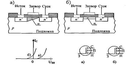 Рис. 1.12. Полевые транзисторы с изолированным затвором: с n—каналом обогащенного (индуцированный канал) (а) и обеденного (встроенный канал) (б) типов