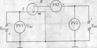 Рис.3.4. б. Схема для измерения характеристик полевого транзистора с каналом n-типа. приборов соответствует типовому включению ПТ с р-n переходом и каналом р-типа (рис. 3.4. а) и каналом n-типа (рис. 3.4. б) Ко входу ПТ, участку затвор-исток прикладывается управляющее напряжение Uзиот регулируемого источника постоянного напряжения Еп1. К выходу ПТ к участку сток-исток прикладывается напряжение Uси от регулируемого источника постоянного напряжения Еп2. В работе необходимо определить экспериментально напряжение отсечки Uзи.ост и снять передаточную характеристику 1с=f( Uзи ) при Uсиconst=10В. Затем необходимо снять семейство выходных характеристик Ic=f(Uси) при Uзи =const. На рис.3.5. приведена схема для исследования зависимости сопротивления канала транзистора от управляющего напряжения затвор-исток Rси =f(Uзи) д ля полевого транзистора каналом р-типа. Предварительно снимают зависимость U вых=Ucи=f(Uзи) Значения управляющего напряжения Uзиустанавливают с помощью источника постоянного регулируемого напряжения от Uзи.ост с до 0.