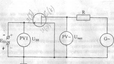 Рис.3.5. Схема, для измерения сопротивления канала транзистора от управляющего напряжения затвор-исток. Значения сопротивления канала ПТ при фиксированных управляющих напряжениях VЗИ рассчитывают по формуле: RCU=R* где UГ и UВЫХ амплитуды переменных напряжений на выходе генератора и между и стоком и истоком полевого транзистора. Задание к работе в лаборатории 1. Записать паспортные данные исследуемого транзистора и зарисовать схему расположения выводов. 2. Собрать в соответствии с типом канала исследуемого ПТ схему, представленную на рис.3.4. Определить экспериментально напряжение отсечки ПТ. Напряжение UЗИ.ОТС (как условно принято на заводах- изготовителях маломощных транзисторов), соответствует определенному току стока, например, равному 10 мкА для ПТ типа КП103, КП305, при напряжении VСИ= 10В. 3. Снять передаточные характеристики I0=f(VЗИ) при VСИ = 5 и 10 В. При снятии характеристик задавать 8 - 10 значений управляющего напряжения VЗИ, в том числе VЗИ =0 и VЗИ = VЗИ.ОТС. Построить передаточные характеристики. 4. Снять стоковые характеристики транзистора при трех значениях напряжение на затворе VЗИ, в том числе при VЗИ =0. Построить семейство стоковых характеристик. 5. Собрать схему, представленную на рис.3.5. В качестве генератора G использовать встроенный генератор с частотой генератора f = 1 кГц. Установить на его выходе напряжение UГ =0,1 В. Приложить между затвором и истоком ПТ постоянное запирающее напряжение, превышающее VЗИ.ОТС. При этом практически все напряжение UГ прикладывается к каналу ПТ (RСИ.ЗАКР>>R) и вольтметр pV~ должен показывать 0,1 В. Затем устанавливают 5...6 значений напряжения VЗИ в пределах от VЗИ.ОТС до 0 и измеряют соответствующие им значения переменного напряжения UВЫХ на канале ПТ с помощью им значения вольтметра pV~. Сопротивление канала определяют расчётным путём по формулу (5.5).