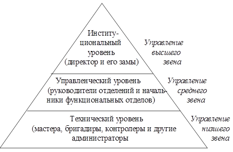Рисунок 1.22 – Уровни управления Очевидным является то, что каждая организация представляет собой достаточно сложную технико-экономическую и социальную систему, отражающую ее индивидуальность и специфику. Описать эту систему возможно, если определить характер взаимодействия на каждом уровне: «организация – внешняя среда», «подразделение – подразделение», «индивид – организация» (рис. 1.23).