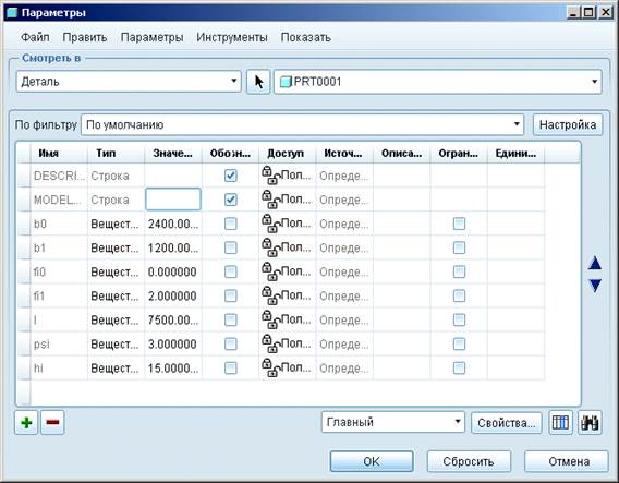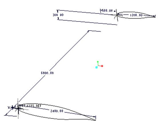 Рис. 3.10. Побудова опорної площини кінцевого профілю крила Побудуйте кінцевий профіль у спосіб, який описаний у комп’ютерному практикумі №1. Для формування параметрів, що керуватимуть хордами й кутами повороту вихідних аеродинамічних профілів та половиною розмаху крила, за допомогою меню «Инструменты->Параметры» створіть наступні змінні: b0 – хорда b 0 кореневого профілю; b1 – хорда b k кінцевого профілю; fi0 – кут j0 повороту кореневого профілю; fi1 – кут jk повороту кінцевого профілю; L – розмах крила; psi – кут y поперечного V крила; hi – кут c стрілоподібності крила. Відповідні результати показано на рис 3.11.