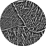 Титановый высокопрочный сплав (группа альфа-сплавов). Пластинчатая структура. Результат аллотропического превращения бета-фазы. Пластины альфа-фазы ориентированы относительно решетки бета-фазы в ее каждом зерне. При большом увеличении в некоторых полях зрения четко различается структура "корзиночного плетения".