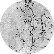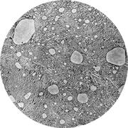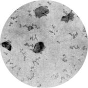 Увеличение: x40000 Марка стали: 08Х18Н10Т Структурные составляющие: аустенит, карбиды Термообработка: 1050° С в течение 1 ч, охлаждение в воде; 600° С в течение 1000 ч, охлаждение на воздухе. Твердость 143 HV.