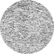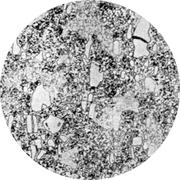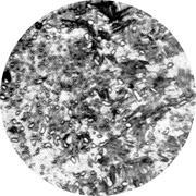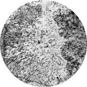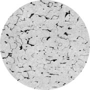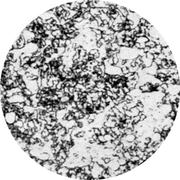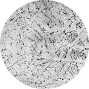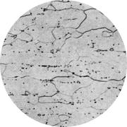 Увеличение: x100 Марка стали: 08Ю Структурные составляющие: феррит, цементит Лист для глубокой вытяжки толщиной 1 мм из мартеновской стали, раскисленный кремнием и алюминием. Прокатка в холодном состоянии на 30%, отжиг при 690° С в течение 20 ч, охлаждение с печью. Прокатка в дрессировочной клети с деформацией 1%. Твердость 95 HV. В удлиненных ферритных зернах и на их границах цементит выделяется в виде мелких частиц. Присутствует некоторое количество включений, которые очень трудно отличить от маленьких черных частиц цементита. Выделения нитрида алюминия не разрешаются.