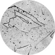 Лист для глубокой вытяжки толщиной 1 мм из мартеновской стали, раскисленный кремнием и алюминием. Прокатка в холодном состоянии на 30%, отжиг при 690° С в течение 20 ч, охлаждение с печью. Прокатка в дрессировочной клети с деформацией 1%. Твердость 95 HV. Очень мелкие прозрачные частицы и большие прямоугольные кристаллы нитрида алюминия.