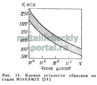 Меньшая чувствительность стали Н18К9М5Т к надрезу проявляется и в условиях усталостного нагружения. По сопротивлению усталости сталь соответствует углеродсодержащим конструкционным сталям равной Прочности, а при ударно-усталостном нагружении ее стойкость в 2-4 раза выше. Как и многим другим мартенситно-стареющим сталям, стали Н18К9М5Т свойственно высокое сопротивление развитию малой пластической деформации. Для достижения максимального предела упругости (o0,002 = 1275-1370 МПа) рекомендуют старение при 450 °С, 4 ч. Ступенчатое старение по режиму 480 °С, 30 мин + 425 °С, 8 ч позволяет повысить предел упругости σ 0,002 до 1575 МПа.