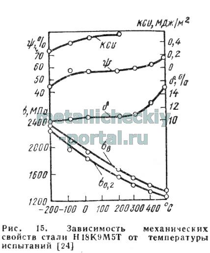 Свойства высоколегированной стали Н18К9М5Т: как конструкционный материал общего назначения наилучшее сочетание прочности, пластичности и вязкости имеют стали, содержащие 17-19 % Ni, 7-12 % Со, 3-5 % Мо, 0,2-1,6 % Ti. Изменением содержания титана в этой системе можно варьировать прочность сталей в широких пределах (1400—2500 МПа). Наибольшее распространение в технике получила сталь типа Н18К9М5Т (ЭП-637). Сталь Н18К9М5Т (ТУ 14-1-1531-75) содержит <0,03% С, 16,7—19,0% Ni, 8,5—9,5 % Со, 4,6—5,5 % Мо, 0,5—0,8% Ti, <0,15% А1. В закаленном состоянии (закалка при 820 °С, охлаждение на воздухе) сталь имеет следующие свойства: σв = 1000-1100 МПа, σ 0,2 = 9004-1000 МПа; δ > 15%. После закалки и старения при 480—500 °С (3 ч) сталь имеет в среднем следующие механические свойства: σв = 1900-2100 МПа; σ 0,2 = = 1800+2000 МПа; δ =8-10%; ψ = 45+55%; КСU=0,5+0,7МДж/м2. В связи с широким и разнообразным промышленным применением было детально изучено влияние режимов термической обработки на комплекс основных свойств стали Н18К9М5Т.