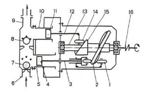 Дифференциальный растворонасос (рисунок 3) обеспечивает высокую равномерность подачи раствора подвижностью не менее 5 см за счет попеременной работы поршней 4 и 11, движущихся в двух параллельных цилиндрах — основном 5 и компенсационном 10. Длина хода основного поршня в 2 раза больше, чем у компенсационного. Штоки 3 и 12 этих поршней кинематически связаны через ролики / и 14 с кулачками торцового типа 2 и /5, расположенными на общем валу 13. Вращение валу с кулачками сообщается от электродвигателя через двухскоростную клиноременную передачу, редуктор и соединительную муфту 16. При вращении кулачка 2 поршень 4 основного цилиндра 5 осуществляет ход всасывания и нагнетания. Во время хода всасывания раствор через всасывающий патрубок 6 поступает в основной цилиндр. При этом всасывающий клапан 7 открыт, а нагнетательный 8 закрыт. Во время хода нагнетания поршень основного цилиндра вытесняет одну половину порции раствора в нагнетательный патрубок 9, а другую — в компенсационный цилиндр 10. При движении основного поршня 4 на всасывание поршень 11 компенсационного цилиндра вытесняет порцию раствора в нагнетательный патрубок 9. На выходе из растворонасоса установлен перепускной кран, позволяющий изменять направление потока раствора из растворонасоса в приемный бункер или в нагнетательную магистраль. Растворонасос имеет двойную производительность (подачу) 2 и 4 м3/ч и перекачивает растворы на расстояние до 300 м (при подаче 2 м3/ч) по горизонтали и до 100 м по вертикали при максимальном рабочем давлении 4 МПа. Им комплектуют передвижные штукатурные станции. Техническая производительность (подача) поршневого растворонасоса (м3/ч)