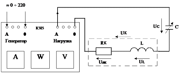 1. Собрать цепь, присоединив к измерительному комплекту К505 исследуемую нагрузку, состоящую из последовательно соединенных катушки индуктивности и батареи конденсаторов. (Схема представлена на рис. 3.1. Элементы схемы расположены на панели № 3 и № 4 лабораторного стенда.) Измерительный комплект К505 (рис. К.1.) содержит амперметр, ваттметр, вольтметр, соединенные по схеме, представленной на рис. К.2. (С. 29).