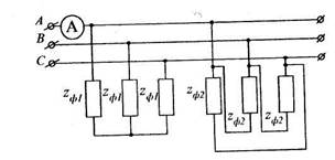 Задача 5.14. До трифазної чотирипровідної мережі з напругою (Uл = 380 В увімкнуто трифазне навантаження, фази якого потужністю РА = 320 Вт; РB = 660 Вт; РC = 760 Вт з'єднані зіркою. Визначити значення струму в лінійному проводі "С", якщо опори фаз споживача мають чисто активний характер. Задача 5.15. До трифазної мережі з напругою Uл = 660 В увімкнено два трифазних симетричних споживачі, фази одного з яких з'єднано зіркою, іншого - трикутником. Визначити показ амперметра, якщо Zф1 = Rф, Zф2 = 3Rф; Rф= 15 Ом.