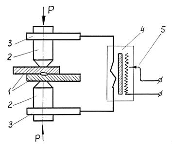 Точечная сварка – способ, при котором заготовки свариваются не по всей поверхности соединения, а в отдельных точках, соответствующих контактам с деталями стержней-электродов. Электрический ток, проходя от электрода к электроду через заготовки, предназначенные для точечной сварки, встречает на своем пути несколько активных сопротивлений. Переходные сопротивления Rn между электродом и заготовкой (рис. 7.10, а) определяются металлом электродов, свариваемым металлом, размерами электродных наконечников и состоянием поверхностей. Контактное сопротивление Rk увеличивается с уменьшением давления и ухудшением чистоты подготовки поверхностей заготовок.