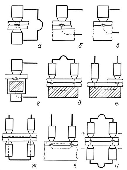 Приемов точечной сварки достаточно много, и наиболее часто они характеризуются способами подвода тока. Классической схемой точечной сварки является сварка двумя электродами с двухсторонним подводом тока (рис. 7.13, а). Иногда в качестве одного из электродов используют плоскую подкладку - шину (рис. 7.13, б). В этом случае медные подкладки устанавливают в месте постановки сварных точек. Если одна из свариваемых заготовок имеет значительно большую толщину, чем другая (в 3 и более раз), ток можно подвести к этой заготовке (рис. 7.13, в). Заготовки, из которых одна тонкостенная и полая, сваривают с использованием токопроводящей вставки (рис. 7.13, г). Точечную сварку можно осуществлять используя односторонний подвод тока (односторонняя сварка). Преимуществами этого вида сварки являются увеличение производительности труда благодаря постановке одновременно двух точек, меньшая электрическая мощность оборудования и большие возможности механизации процесса сварки по сравнению с двусторонним подводом тока. В большинстве случаев сварку выполняют с использованием токопроводящей подкладки (рис. 7.13, д, е) или замкнутых накоротко нижних электродов (рис. 7.13, ж). Одностороннюю сварку можно вести и без токопроводящей подкладки (рис. 7.13, з), если толщина заготовки, обращенной к электродам, значительно меньше толщины другой заготовки. Особенность приемов сварки с односторонним подводом тока (кроме рис. 7.13, е) заключается в том, что часть тока, подводимого электродами, не проходит через зону сварки, а замыкается (шунтируется) по верхнему листу. Ток, проходящий по верхнему листу, вызывает его нагрев и повышенный износ электродов. В специальных машинах используют схему двухточечной сварки с двусторонним подводом тока (рис. 7.13, и).