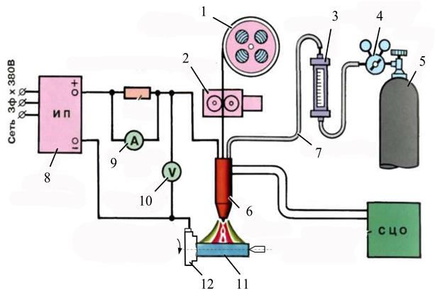 Рис. 8.4. Принципиальная схема установки для дуговой наплавки в среде углекислого газа: 1 – кассета с проволокой; 2 – подающий механизм, 3 – ротаметр; 4 – редуктор; 5 – баллон с углекислым газом, 6 – наплавочная головка; 7 – рукав, 8 – источник питания дуги, 9 – амперметр, 10 – вольтметр, 11 – наплавляемая деталь, 12 – патрон вращателя, СЦО – система циркуляционного охлаждения