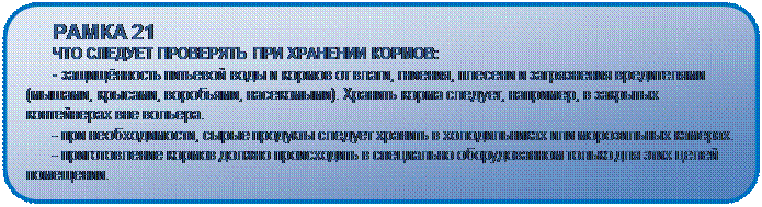 Важно, чтобы корм для животных приготавливали правильно. Фрукты и овощи часто обрызгивают инсектицидами и удобрениями. Для предотвращения отравления животных этими токсинами перед скармливанием все свежие овощи и фрукты следует тщательно мыть пресной питьевой водой. Всегда осматривайте корм прежде, чем дать его животным. Например, в сене и траве могут быть погибшие грызуны, токсичные растения или другие опасные объекты. Запасы пищи и воды должны храниться в соответствующих санитарных условиях (Рамка 21).
