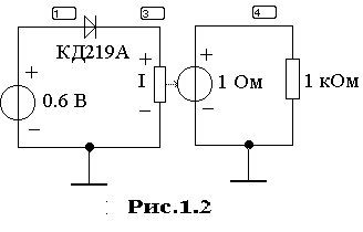 Моделирование. Для моделирования ВАХ диода составляется схема, показанная на рис.1.1. Отдельные элементы схемы (источник напряжения, прибор для измерения тока и диод) переносятся на поле чертежа после нажатия кнопок с соответствующим обозначением на панели инструментов и вытягивания при помощи удержания левой кнопки мыши в нажатом состоянии. Ориентация элементов на поле может быть изменена при помощи команд в окне, открывающемся после нажатия правой кнопки мыши. Необходимые значения напряжения источника устанавливаются в специальном окне, открывающемся после подведения курсора и двойного щелчка левой кнопкой мыши на значке элемента. Для выбора необходимого типа диода следует поступить аналогичным образом: после открытия окна с библиотеками выбрать ту, в которой должен содержаться диод, а затем после щелчка левой кнопкой мыши – тип диода. Соединение элементов в схему производится при помощи подведения курсора к электродам и удержания в нажатом состоянии кнопки мыши. Следует обращать особое внимание на надежность соединений, которое подтверждается появлением в месте соединения точки большого диаметра, а также на необходимость заземления схемы, без которого моделирование невозможно. Температура по умолчанию равна 270С. Для ее изменения следует нажать кнопку Analysis, затем Analysis Options, Global и в открывшемся окне установить необходимую температуру (500С). Для снятия ВАХ при каждом установленном напряжении источника программа переводится в режим моделирования с помощью кнопки в верхнем углу основного окна, и определяется протекающий через диод ток по амперметру.